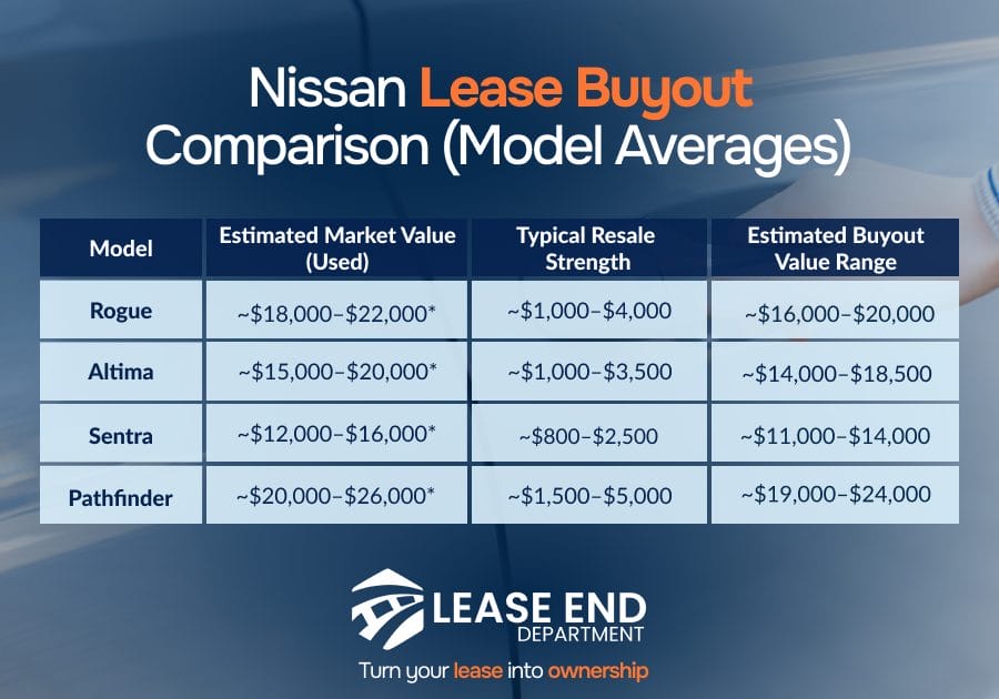 - Popular Nissan models often retain value: The Rogue, Altima, Pathfinder, and Sentra tend to perform well in the resale market, giving you stronger buyout upside